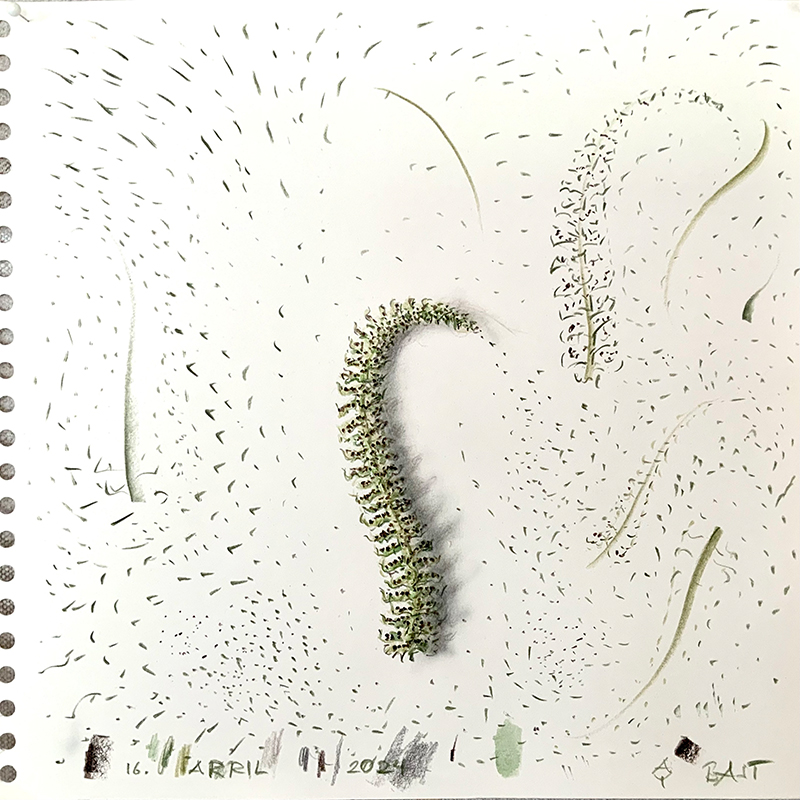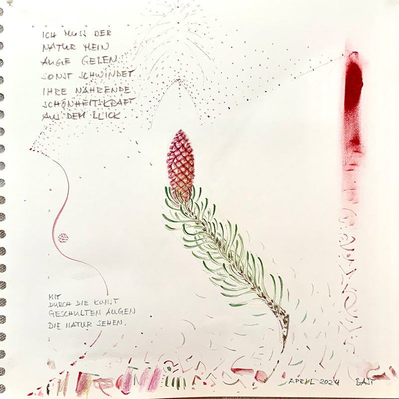 Alfred Bast sagt hierzu: „Alles was die Natur – die in Gestalten spricht – hervorbringt, ist mir anschauungswert: der Anschauung wert. Hinschauen … Wahrnehmen … dann: DAS SEHEN IN DIE HAND NEHMEN … Den Blick – wie ein Lot – ins Vertraute senken, um unter der spiegelnden, reflektierenden Deutungsoberfläche dessen universellen Ursprung auszuloten – um im Sichtbaren das Unsichtbare zu entdecken.“ Und er bezieht sich dabei auch auf Goethe: „Man suche nur nichts hinter den Phänomenen, sie selbst sind die Botschaft“ Im Kunstfenster vereint Alfred Bast eine Auswahl von Zeichnungen und Objekten zu einer Inszenierung, die in einen Dialog mit der Natur am Wolkenhof tritt und zum Hineinschauen einlädt. Alfred Bast www.alfred-bast.de * 1948 in Schwäbisch Gmünd, lebt und arbeitet in Abtsgmünd und Berlin. Er studierte Freie Kunst an der Akademie der Bildenden Künste in Stuttgart und in Pondicherry-Auroville/Indien. Unterstützt mit Stipendien, darunter die Studienstiftung des deutschen Volkes und die Kunststiftung Baden Württemberg sowie internationalen Aufenthalten als Artist in Residence erarbeitete er seine komplexe Bildsprache. 1995 gründete er das KUNST KLOSTER art research. Zwischen unterschiedlichen Materialien und Stilen, zwischen gegensätzlichen Polen, wie Bild und Wort, Natur und Kunst, Handwerk und Spiritualität, Fantasie und Geometrie, bildet sich das Spannungsfeld, in dem sich die bildnerische Weite und gedankliche Tiefe des Künstlers entfalten. In seiner Arbeit wird sichtbare Vielfalt zum Ausdruck unsichtbarer Einheit. about the exhibition The artist Alfred Bast, who lives in Abtsgmünd and Berlin, has been exploring the formal language of nature all his life. He draws flowers, grasses, fruit, trees, branches and ornaments with a precise eye. Or he lets nature speak for itself when he elevates the objects it produces - seed pods, pods, wasps' nests, mushrooms, branches - to the status of art and exhibits them. Alfred Bast says: “Everything that nature - which speaks in forms - produces is worth looking at: worth looking at. Look ... perceive ... then: TAKE THE SEEING INTO YOUR HAND ... Lower your gaze - like a plumb line - into the familiar in order to fathom its universal origin beneath the mirroring, reflecting surface of interpretation - in order to discover the invisible in the visible." And he also refers to Goethe: “Just don't look for anything behind the phenomena, they themselves are the message” In the art window, Alfred Bast combines a selection of drawings and objects to create a staging that enters into a dialog with nature at the Wolkenhof and invites you to look inside. Alfred Bast https://www.alfred-bast.de/ * born 1948 in Schwäbisch Gmünd, lives and works in Abtsgmünd and Berlin. He studied fine art at the Academy of Fine Arts in Stuttgart and in Pondicherry-Auroville/India. Supported by scholarships, including the Studienstiftung des deutschen Volkes and the Kunststiftung Baden Württemberg, as well as international residencies, he developed his complex visual language. In 1995 he founded the KUNST KLOSTER art research. Between different materials and styles, between opposing poles such as image and word, nature and art, craft and spirituality, fantasy and geometry, a field of tension is created in which the artist's pictorial breadth and intellectual depth unfold. In his work, visible diversity becomes an expression of invisible unity. |