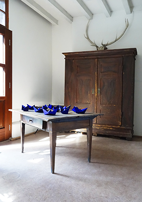 Im Sommer 2022 besuchte die Mannheimer Fotografin Susanne Neiss den Wolkenhof zum ersten Mal. Der Ort inspirierte sie zu neuen Arbeiten und zur Rauminstallation „Sail“, die sie am Wolkenhof eingerichtet hat. Drei in ihrer Farbigkeit durchdringende Arbeiten changieren zwischen Fotografie und Malerei. Beim Betrachten lassen sie den Geist frei fließen, Assoziationen von Sommer, Strand, Südsee tauchen auf, Dynamik und Ruhe wechseln einander ab. Doch unter der reflektierenden, schimmernden Oberfläche liegt eine zweite, tiefere Ebene.