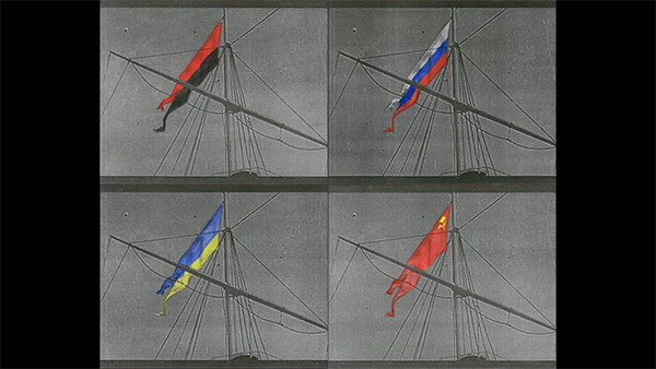 Das beweist einmal mehr, dass sich das Meisterwerk erfolgreich in einem bestimmten Trend etablieren kann. Selbst die schlimmsten Ideen können mit künstlerischen Mitteln propagiert werden. Der Höhepunkt des Films, der die vorherige These bestätigt, ist das Hissen einer roten Flagge über dem Deck des Schlachtschiffs. Aufgrund der Besonderheiten des Schwarz-Weiss-Kinos war es jedoch schwierig, die rote Farbe der Flagge zu zeigen. Deshalb beschloss Sergei Eisenstein, eine weisse Flagge zu nutzen. Anschliessend malte er, jedes Einzelbild des Films, wo eine Flagge dargestellt wurde, in Rot an. In meiner Arbeit wiederhole ich die Geste des Regisseurs, indem auch ich die Fahnen einfärbe, mit dem einzigen Unterschied, dass ich statt der Farbe der bolschewistischen Flagge die Farben der einflussreichsten Ideologien verwende, um die in der modernen ukrainischen Gesellschaft gekämpft wird.
