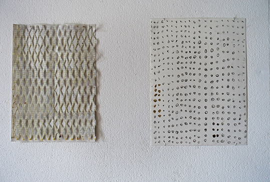 Maria Tackmann Durchscheinen und Leuchten 7.7.2019 - 28.7.2019 Eröffnung Sonntag 7.7.2019 ab 15:00 Uhr in Anwesenheit der Künstlerin Öffnungszeiten: Samstag, Sonntag jeweils 13-17h, oder nach Absprache. Eintritt frei Gastkünstlerin am Wolkenhof Als Gastkünstlerin verbrachte Maria Tackmann den Monat Juni am Wolkenhof. Die deutsch-schweizerische Künstlerin interessiert sich für Materialien und Strukturen, die normalerweise unterhalb unserer Wahrnehmungsschwelle bleiben: Strassenbeläge, Erosionsspuren, Zurückgebliebenes, Papier, Reste von Baumaterialien, Webmuster ... Sie legt daraus Sammlungen scheinbar belangloser Objekte an und bringt sie in ihren Installationen in neue Beziehungsmuster: Das Atelier ist der Wohn- und Arbeitsraum, in dem sie ihre Beobachtungen anordnet. Die im Hof gesammelten Steinchen verwandeln sich als Auslegeordnung auf dem Atelierboden zum Teppich. Zeichnungen an der Wand greifen dieses Punktmuster auf und variieren lineare Strukturen. Auf dem Tisch vor dem Sofa liegen Kopier-Experiemente aus, die auf einem in Murrhardt erstandenen Second-Hand-Kopiergerät entstanden sind. Wenn man ein Blatt Karopapier oft genug vergrössert, zerfallen die Linien zu Punkten, ähnlich den Steinchen am Boden. Der Staub, der von alten Dachschindeln gebürstet wird, bildet einen Kreis am Boden. Die Papiere im Fenster wurden mit zweierlei Bienenwachs vom Wolkenhof getränkt. Sie thematisieren das Spiel des Lichts, das Durchscheinen und Leuchten. Artist in Residence The German-Swiss artist Maria Tackmann spent the month of June 2019 as artist in residence of the Wolkenhof. Maria Tackmann is interested in materials and structures, which usually remain below the level of perception: road surfaces, traces of erosion, remnants, waste paper, leftovers of construction materials, waving patterns… She assembles samples of seemingly insignificant objects and arranges them in her installations to a new relational order. The Wolkenhof studio room becomes the living and working space, where she puts her observations together. Loose chippings from the road outside turn into a carpet like dot pattern at the studio floor. Drawings refer to this dot pattern and also to linear structures from the outside environment. The low coffee table displays a series of Xerox copy experiments performed on a second hand copy machine she acquired during her stay in Murrhardt. If you copy a grid paper many times with the zoom function lines will decompose into dots like the pebble pattern at the floor. Used shingles from an old roof are cleaned with a brush and the forms a circle at the floor. the paper sheets in the window were soaked in beeswax from the Wolkenhof beehives. They emphasize the play of light, it’s shining through and glowing. Maria Tackmann 1982* Wattenwil, Schweiz Fachklasse Grafik Schule für Gestaltung Bern/Biel, Staatliche Akademie der Bildenden Künste Karlsruhe, Prof. Helmut Dorner und Prof. Silvia Bächli, Meisterschülerin bei Prof. Silvia Bächli Einzelausstellungen: 2019 Diverse Materialien, Dimension variabel, Stiftung CCFA Karlsruhe 2018 tour autour, Betriebswerk Heidelberg Zeichen, Rudolf-Scharpf-Galerie, Ludwigshafen 2016 Pförtnerhäuschen, Alter Schlachthof Karlsruhe Mezzanin, Einraumhaus c/o Mannheim 2014 Parterre, Kunsthaus L6, Freiburg 2012 Am Ende genügt ein Fach, Galerie Meyer Riegger, Karlsruhe 2011 ziemlich regelmässig, Konsumat, Pforzheim Gruppenausstellungen: 2018 Im Schwarm der Objekte, Galerie der Cité Internationale des Arts, Paris surface mouillée, Cité Internationale des Arts, Paris 2017 Für die Ewigkeit - Archivarische Strategien in der Kunst, Kunstraum Alexander Bürkle, Freiburg Green room, PIK Projektraum im Kunstwerk, Köln; Arrazzo, (mit Johanna Broziat) Atelierhaus im E-Werk, Freiburg; sans titre (paramètres composés), Stadtgalerie Bern 2016 Cantonale Berne/Jura, Wie Tag und Nacht, Kunstmuseum Thun; Gastmahl, Museum der Brotkultur Ulm; Regionale 17, Encoding the urban, La Kunsthalle Mulhouse; 4 Säulen im Westen, Karlsruhe; Deltabeben, regionale 2016, Kunstverein Mannheim 2015 Mobiles Museum, Pforzheim; Höhenluft #10, Kunstverein Wilhelmshöhe, Ettlingen; BERN BABY BERN, Kunstmuseum Thun 2013 Cantonale Berne/Jura, Kunstmuseum Thun und Stadtgalerie Bern; Top13, Kunstverein Freiburg 2012 Höhenluft #2, Kunstverein Wilhelmshöhe, Ettlingen 2011 Swiss Art Awards, Basel 2010 Regionale 11, Kunsthaus Baselland; Purple rain, Galerie Iris Kadel, Karlsruhe Preise, Förderungen und Stipendien: 2018 Cité Internationale des Arts, Paris 2016 Publikationsförderung, Ministerium für Wissenschaft, Forschung und Kunst BW 2014 Kunstpreis Alexander Bürkle, Freiburg 2013 Reisestipendium (Athen) der Landesgraduiertenförderung Baden-Württemberg 2010 Preis der Staatlichen Akademie der Bildenden Künste Karlsruhe |