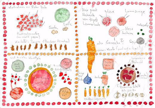 BLUMENKOHL Mundstück Nr. 17 In Les Amazones de la voie lactée (1973), der etwas banalen Geschichte eines von kriegerischen Frauen durch allerlei Weltraumabenteuer gesteuerten Kampfschiffes, beschreibt die Autorin mit dem Pseudonym Uhoura einen von primitiven Humanoiden bewohnten Planeten namens Brassika, auf dem Blumenkohl (oder Karfiol, wie ihn die Österreicher nennen) ausschliesslich zu rituellen Zwecken angebaut wird. Wenn ein Streit zwischen zwei Stämmen ausbricht, dann versammeln sich Repräsentanten beider Gruppen in der Halle des Krieges, wo sie sich gegenseitig die wüstesten Beleidigungen an den Kopf werfen. In einem zweiten Schritt werden auf beiden Seiten ebenso viele Blumenkohl-Köpfe annihiliert, wie es Kontrahenten gibt. Nach Abschluss dieser kulinarischen Katharsis sind die Parteien gehalten, die Art des Sprechens über den jeweiligen Gegner zu verändern. Ausgiebig beschreibt Uhoura alle Details dieses Rituals – ein für die siebziger Jahre typischer Versuch, Modelle für unblutige Konfliktlösungen zu entwickeln. Dass die Autorin ausgerechnet den Blumenkohl als Peacemaker einsetzt, und nicht irgendein anderes Gemüse, ist natürlich kein Zufall. Form, Farbe und Grösse des Karfiols ähneln dem menschlichen Gehirn und machen den Kreuzblütler so zu einem idealen Stellvertreter in einem Ritual, welches die symbolische Totalvernichtung des Gegners vorsieht. Ganz besonders oft wird das menschliche Gehirn als Blumenkohl angesprochen, wenn Wahnsinn oder Dummheit mit im Spiel sind – ja es kommt einem manchmal vor, als sei der Blumenkohl eine Art Degenerationsform unserer zerebralen Zentrale. Es gäbe Beispiele zuhauf aus der Literatur – ein besonders farbiges Exempel liefert Gustav Sack (1885–1916). Wenn er in seinem Romanfragment «Paralyse» beschreibt, wie der Irrsinn an seinem Verstand nagt, dann kommt in dem Passus wie selbstverständlich auch der Blumenkohl vor: «Es ist totenstill und abertausend kleine Korkenzieher, immerfort, sie bohren in mir immerfort, in meinem Blut, in meinem Saft, in meinem Hirn, ah! dieser rotgescheckte Blumenkohl! Wie schwer er ist, wie Stein; [. . .] und in meinem hortensienroten Hirnblumenkohl wachsen tückische Granulationsgeschwüre, die degenerieren fettig und verkäsen.» Fast scheint es, als wirke das Bild vom vegetabilen Hirn in uns so stark nach, dass wir den Karfiol mitunter als eine Art Wesen ansehen. Wenn wir uns zum Beispiel einen Mann vorstellen, der sich auf einer Parkbank mit einem Blumenkohl unterhält, dann kommt uns das auf jeden Fall weniger seltsam vor, als wenn er dasselbe mit einer Tomate täte – oder etwa nicht? Auch abgesehen von seiner Hirnförmigkeit ist der Karfiol ein ganz ausserordentlicher Charakter. Allein sein Gewicht macht ihn schon zum Sonderfall in der sonst eher leichtlebigen Gemüsewelt. Und dann die Selbstverständlichkeit, mit der er sich von unseren Fingern umgreifen lässt, als wäre er aus unserer Hand herausgewachsen. Man könnte tanzen, mit einer Rosette in jeder Hand, einen feierlichen Blumenkohlwalzer – wenn wir das mit zwei Gurken täten, sähe es nach einer absurden Performance aus, mit Karfiol aber hätte es eine eigene Schönheit. Wenn man einen Blumenkohl aus den festen Blättern löst, die ihn wie ein Reifrock umgeben und noch majestätischer erscheinen lassen, dann spürt man, dass man da etwas Besonderes auspackt. Gurke oder Radieschen, Lattich und Kohlrabi, das sind alles eher Sklaven unseres Appetits – beim Blumenkohl aber ist das anders, er ist eine Perle, die wir mit Respekt berühren. Dabei soll, was wir als Blumenkohl essen, im Grunde die Missbildung einer Blüte sein – von Gärtnern in Kleinasien erdacht und erzüchtet, von den Genuesen oder den Venezianern im 15. oder 16. Jahrhundert nach Westeuropa verschleppt. Auf jeden Fall ist der Karfiol ein Embryo, eine Rosette aus Knospen mit stark verdickten Stengeln, die manche Köche mehr noch schätzen als die käsigen Teile – so belehrt etwa Frau Dörr in Theodor Fontanes Irrungen, Wirrungen die Schneidermamsell Lene: «Dass es immer die Köppe sein müssen, is ja dummes Zeug. Ebenso wie mit ‚n Blumenkohl; immer Blume, Blume, die reine Einbildung. Der Strunk is eigentlich das Beste, da sitzt die Kraft drin. Und die Kraft is immer die Hauptsache.» Roh hat der Blumenkohl einen hellen holzigen Duft und ein leicht pelziges bis nussiges Aroma mit einer leichten, etwas harzigen Schärfe. Gedünstet entwickelt er einen zurückhaltenden Kohlgeschmack mit Moschusnote. Seine Konsistenz, im akkurat gegarten Zustand irgendwo zwischen Marzipan und einem weichen Alpkäse, lässt ihn nährender wirken als anderes Gemüse, voll und reich. Dabei gibt er sein luxuriöses Fleisch grosszügig her, ohne grosses Wenn und Aber. Wollte man sich modisch geben, könnte man von einem barocken Gemüse sprechen. Vielleicht rührt es daher, dass sich der Blumenkohl trotz aller Käsigkeit im Mund auch immer leicht unwirklich anfühlt, als könnten wir das rechte Verhältnis zu ihm nicht finden, als sei er ganz gross und ganz klein zugleich, ganz nah und ganz fern – nicht ganz von diesem Planeten. > Text aus: Samuel Herzog: Mundstücke. Zürich: Rotpunktverlag, 2017. ![]() AUBERGINE Die Wahrheit Eine schusselige Biene, die immer alles durcheinander brachte, setzte sich eine Tages auf eine Aubergine, weil sie die Frucht für eine schwarze Blüte hielt. Die Aubergine spürte den sanften Kuss des Insektenrüssels auf ihrer Haut und verliebte sich sofort in das kleine Tier. Als die Biene weitersummte, flog ihr die Aubergine heimlich hinterher. Nach einer Weile allerdings bemerkte die Biene, dass sie verfolgt wurde und drehte sich um. In den Augen der Biene erkannte die Aubergine sofort, dass sie nicht fliegen konnte, stürzte ab und zerbarst in hundert Teile. Eine Biene mag eben noch so verwirrt sein, ihre Augen sagen doch immer die Wahrheit. > Text aus: Jana Godet: Ist wahr! Kleine Geschichten aus Lemusa. Port-Louis: Édition Ruben66, 2017. ![]()