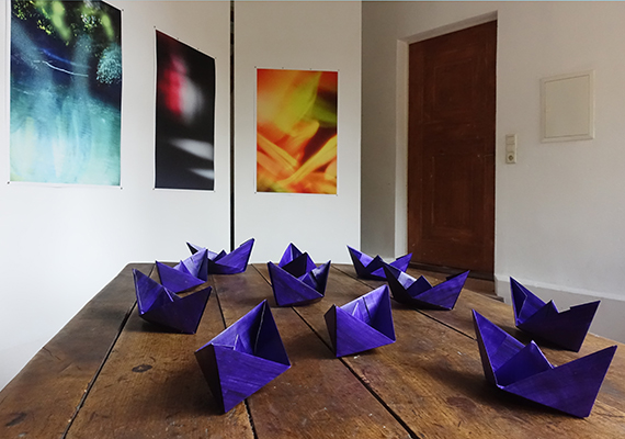 Text Susanne Neiss. Rekonstruktion Die Harmonie der Bilder wird durch einen Text der Künstlerin kontrastiert, in dem sie sich mit einem Lebenstrauma auseinandersetzt. Verdrängte Erinnerungen und Gefühle brechen unvermittelt hervor. Text und Bild verbinden sich im Atelierraum des Wolkenhofs zu einem neuen Klang, auf den die Künstlerin selbst gespannt ist. Nur das Reiseziel steht fest: Freiheit und intensive Auseinandersetzung. Susanne Neiss https://www.susanne-neiss.de/ * 1971 in Worms, lebt und arbeitet in Mannheim Studium Kommunikationsdesign an der Hochschule Mannheim Gastsemester an der Hochschule für Grafik und Buchkunst, Leipzig Seit 2006 Lehrauftrag an der Freien Kunstakademie Mannheim (FKAM) Ausstellungstätigkeit im In- und Ausland about the exhibition In the summer of 2022, the Mannheim-based artist Susanne Neiss visited the Wolkenhof for the first time. The location inspired her to create new works and the spatial installation "Sail", which she has set up for the artist window. Three works with pervasive colors oscillate between photography and painting. While viewing them, they permit the mind to flow freely, associations of summer, beach, South Seas emerge, dynamics and tranquility alternate. But underneath the reflective, shimmering surface lies a second, deeper level. The harmony of the images is contrasted by a text written by the artist which reflects on a trauma in her life. Repressed memories and feelings push abruptly to the surface. Text and image merge in the Wolkenhof's studio space to form a new sonority, which the artist herself is eager to discover. Only the destination is certain: freedom and intense involvement. Susanne Neiss https://www.susanne-neiss.de/ * 1971 in Worms, lives and works in Mannheim studied communication design at the Mannheim University of Applied Sciences Guest semester at the Academy of Visual Arts, Leipzig Since 2006 teaching position at the Freie Kunstakademie Mannheim (FKAM) |